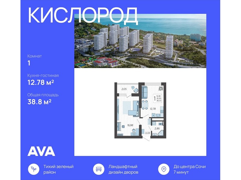 | Продается 1-комнатная квартира в новостройке ЖК "Кислород" Литер 5. Общая площадь квартиры - 38.8 кв. м., этаж 19 из 19. Без отделки, но с возможностью заказать отделку.