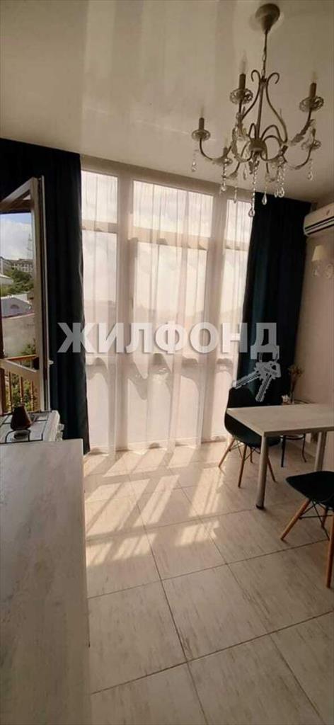 Квартира с панорамными окнами и небольшим балконом с красивым видом на море и город.