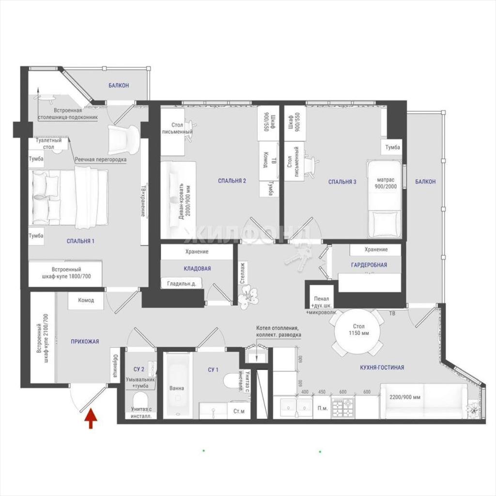 Прекрасная, эргономичная планировка- 3 изолированные спальни, кухня-гостиная, два санузла, гардеробная, кладовка, вместительная прихожая, два балкона и очень много мест хранения. Площадь 80 м2 с балконами, внутри 75 м2.